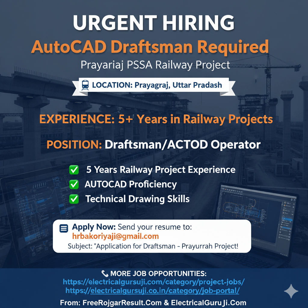 🏗️ AutoCAD Draftsman Required for Prayagraj PSSA Railway Project We are seeking an experienced AutoCAD Draftsman for the prestigious Prayagraj PSSA Railway Project in Uttar Pradesh. This is an excellent opportunity for skilled drafting professionals to contribute to a major railway infrastructure development. 📋 Project & Position Details: Project Name: Prayagraj PSSA (Railway Projects) Position: Draftsman/AutoCAD Operator Location: Prayagraj, Uttar Pradesh Experience […]
